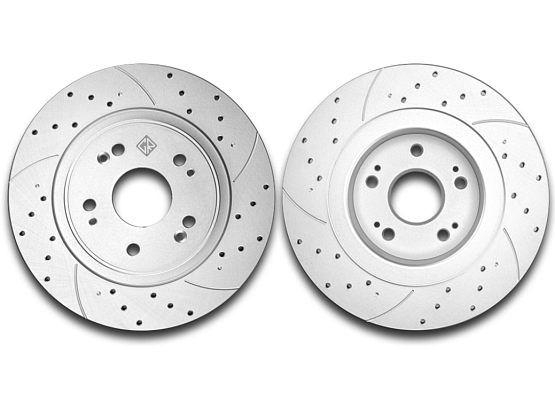 - Перфорация и слотирование: большинство дисков имеют сквозную или неполную перфорацию. Перфорация обеспечивает более лучшее охлаждение и удаление газа возникающего при трении, а слотирование помогает очищать поверхность от продуктов износа. В дисках Great применено узкое слотирование, что снижает уровень шума при торможении.